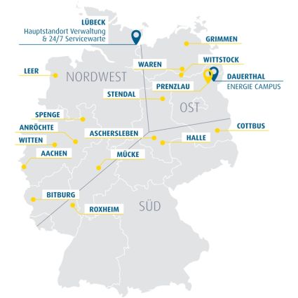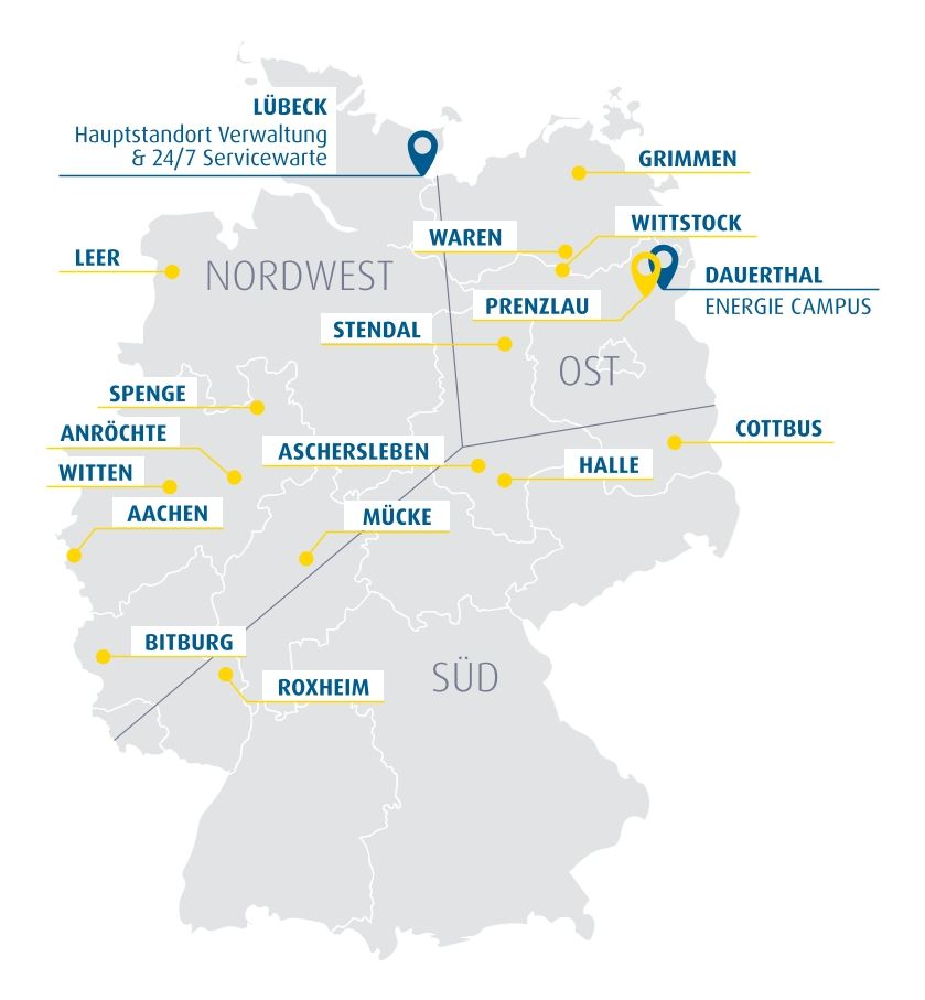 O serviço ENERTRAG garante a operação econômica de sua turbina eólica e oferece manutenção, reparo e serviço completamente a partir de uma única fonte. Com 16 estações de serviço na Alemanha e bases na França, Polônia e África do Sul, a ENERTRAG Service tem os melhores pré-requisitos para suporte completo para turbinas eólicas.