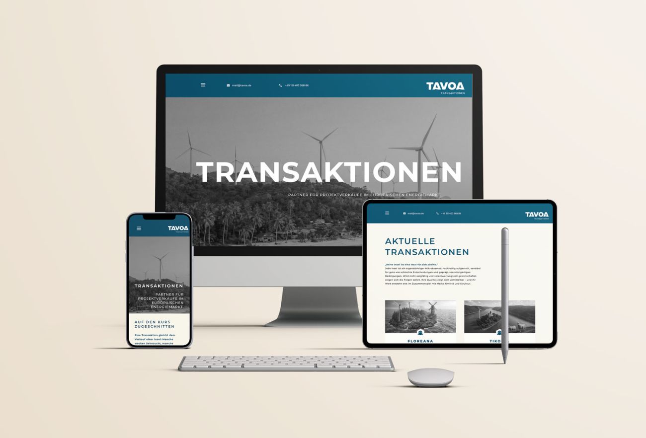 TAVOA significa transações que funcionam: precisamente preparadas, claramente estruturadas e com um olhar seguro para o que é um projeto. Para o lado vendedor e o lado comprador, eles criam uma passagem confiável — por meio de análise, experiência e a capacidade de distinguir o essencial do não essencial. Isso cria uma linha de navegação que guia todos os participantes com segurança.