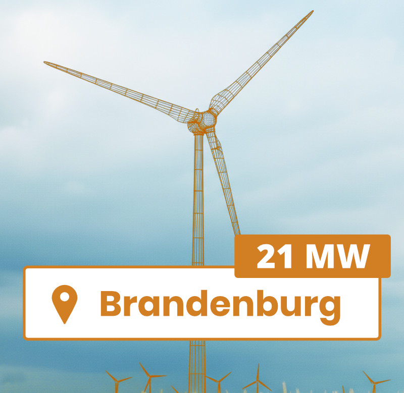 A oferta inclui um projeto eólico diretamente em Brandemburgo com potencial total de 21,6 MW (3 turbinas eólicas). Atualmente, dois locais com capacidade combinada de 13,2 MW estão garantidos sob a lei de planejamento por decisão preliminar, de acordo com a Seção 9 (1a) da Lei Federal de Controle de Imposições.